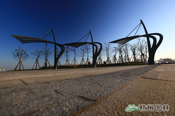 滨海广场是滨海片区建成的首个大型景观广场,整个广场以开发区展馆为中心,分为东西两大块,东边以广场铺装为主,西边以植物配置为主。结合大面积铺装、竹木地板、彩胶石、园路及特色植物配置,将整个广场分为七大观赏区,分别是露天剧场、雕塑小品、人行路桥、活动广场、异形种植池、滑板坡道、挡浪墙和波浪形台阶。工程以现代风格为主题,呈现一种时尚与实用相结合的现代园林景观特色,是一个集休闲、娱乐、康体健身于一体的海滨标志性区域。