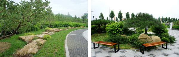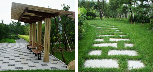 而在道路十字路口的节点处,则主要是用10cm×10cm的小花岗岩铺地,铺出来的路面整洁、平坦,看似简单,实则对施工技术要求相当高。草坪中的地面铺装,则采用花岗岩汀步,用错缝铺装法,两块花岗岩之间用草皮镶嵌,就像给每块花岗岩镶了一道绿边,与旁边的草坪和谐地融为一体。贯穿整个工程的游憩步道,全部采用"人字形"的铺装方法,中间用透水砖、两边以花岗岩镶边,透水砖价格不高,用以镶边的花岗岩是利用了铺装中剩余的边料,虽然用料简单,但通过对技术的严格要求,铺出的路面却整洁而不失韵味,是一种实用、环保、节约的做法。