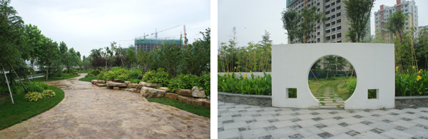 每个景观节点上,植物的配置方法都是不一样的,如在下沉广场,主要是以小龙柏、金叶女贞等小灌木片植成方形或弧形,间或点缀石楠、梅树,看起来规整、简洁;而在设计风格为江南园林的南广场上,是将贵重的造型油松单植,通过不同的组合,形成三个风格相近的绿岛,周边种植美人蕉、玉簪、竹子,并砌起白墙,上面开圆形拱门或圆窗,散发出诗意江南的静谧和婉约气息。"游憩步道是贯穿整个景观的轴线,为了形成曲径通幽的景观效果,我们将对植、孤植、丛植都多种方法结合运用,特别是在三叉路口,多种植海棠、樱花、杏花等,一方面,花开的时候,绿叶间繁花点点,会吸引人们不断向前探寻更多的美景;而花落之后,茂密的枝叶又形成隐隐约约的视觉感受,前方转过弯后风景什么样,又让人很想去看看。"高经理笑着说。