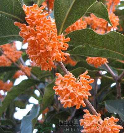 “火炼金丹”桂花:常绿小乔木,高3-5米,冠形、叶型似金球桂,观赏性状良好;零星分布于江苏、浙江、江西一带,适应性广泛。本品种花冠裂片边缘金黄色,其他部分橙黄色,为桂中珍品,用于园林绿化点缀,效果极佳。