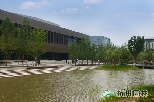 从滨江区江虹路的西入口处走进华为杭州生产基地,首先映入眼帘的是广场上大小不一的花池,一棵棵银杏、香樟、桂花生长得郁郁葱葱,昭示着无限的生机与活力。脚下的铺装,一边是菠萝格防腐木,一边是规则的花岗岩,一“软”一“硬”,相映成趣,蜿蜒延伸,直通前方的人工湖。清澈的湖水,在夏日阳光的照耀下,波光粼粼,偶尔一阵风来,一圈圈的涟漪荡漾,整个湖面都动了起来,让人忍不住加快脚步,去一睹前方的美景。这就是华为杭州二期生产基地景观绿化分包工程一标段的现场景观,该工程由开云足球体育承建,曾荣获2013年度浙江省园林绿化工程安全文明施工标化工地。