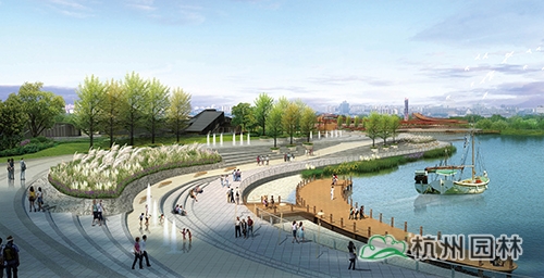 水岸广场:台地张弛有度,将台阶、坡道、草坪、木平台、广场组成丰富的滨水空间,流线型的岸线贯穿整个台地,形成一条观光滨水走廊,结合滨水岸线设置游船码头、亲水平台,形成极具特色的水岸广场。
