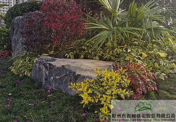 项目中应用了许多景石,为了避免出现视觉的疲惫,每块景石的形态、大小、植物配置都各有千秋。在一些入口和节点处,通过景石与色叶植物、开花植物、球类植物的有机搭配,营造出一个个意趣盎然的花境景观。