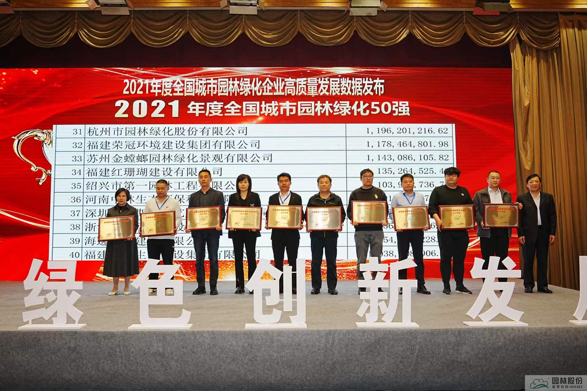 全国城市园林绿化企业50强,由《中国花卉报》社聘请业内专家组建的审核专家委员会,根据全国城市绿化影响力企业年度数据排名,是风景园林行业的权威奖项,较为全面地反映了企业的综合实力及行业美誉度。